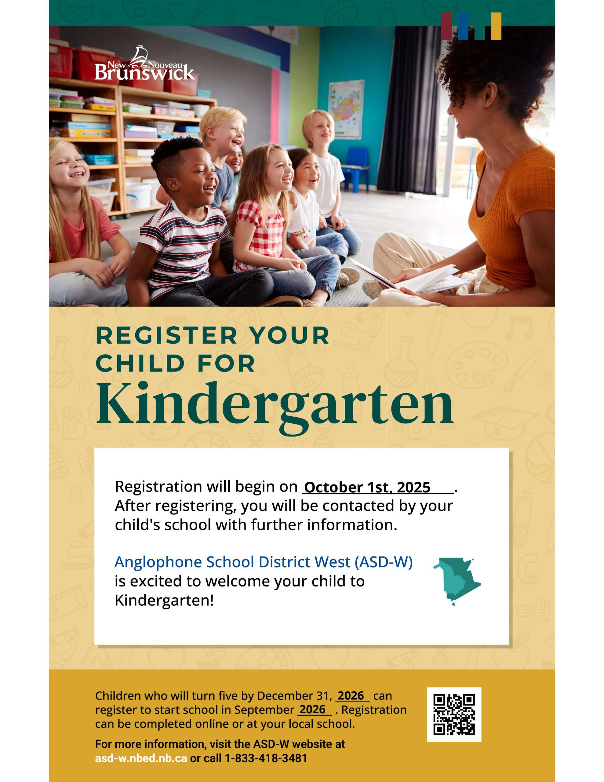 Registration occurs between October 1-31, 2025. After registering, you will receive information to support your childβs transition to public school. Anglophone School District West (ASD-W) is excited to welcome your...